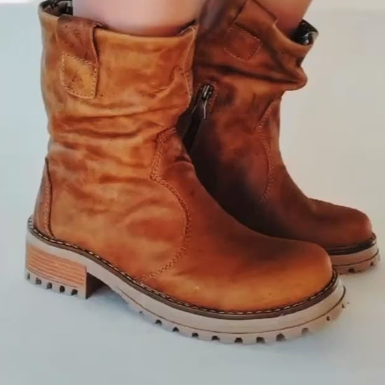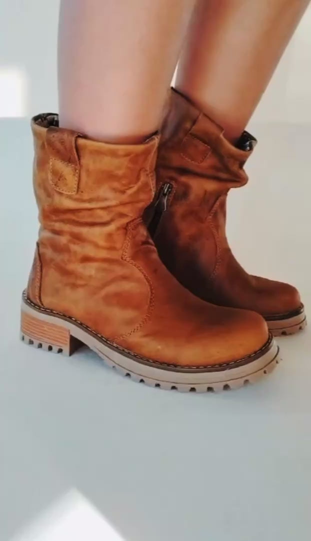bota corta de cuero camel oxido es perfecta para cualquier ocasión con su suela baja de goma, cierre interior y badana natural. El cuero liso y acolchado garantiza comodidad y durabilidad. ¡Cómoda y elegante al mismo tiempo!