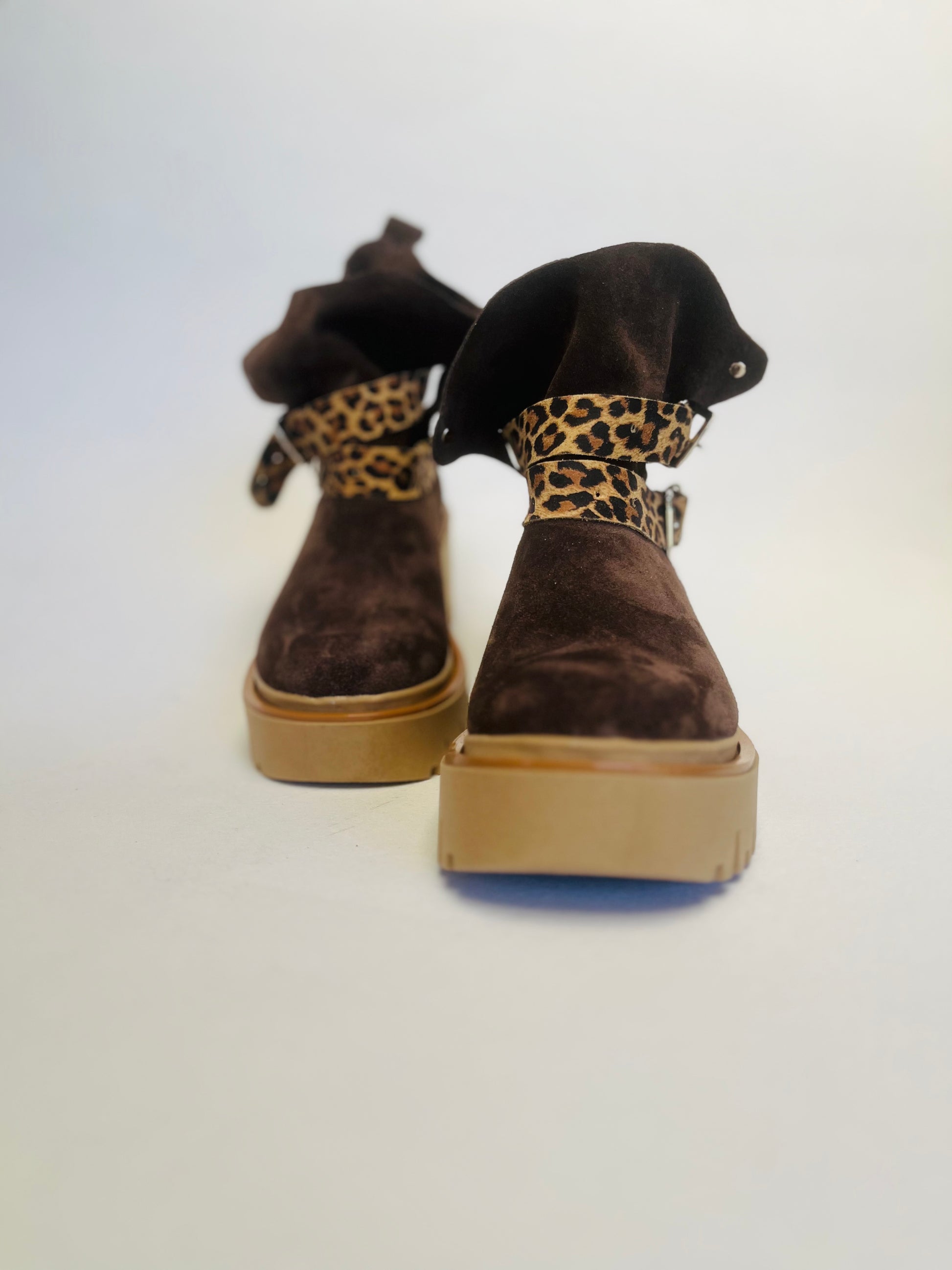 Este botín de verano de reno en color café cuenta con un diseño único de animal print, forrado en su interior con badana natural desde los tobillos para mayor comodidad. Su suela de goma proporciona un buen agarre y estabilidad. Además, incluye correas intercambiables para un estilo versátil. ¡Conviértete en el centro de atención con este botín de reno natural!