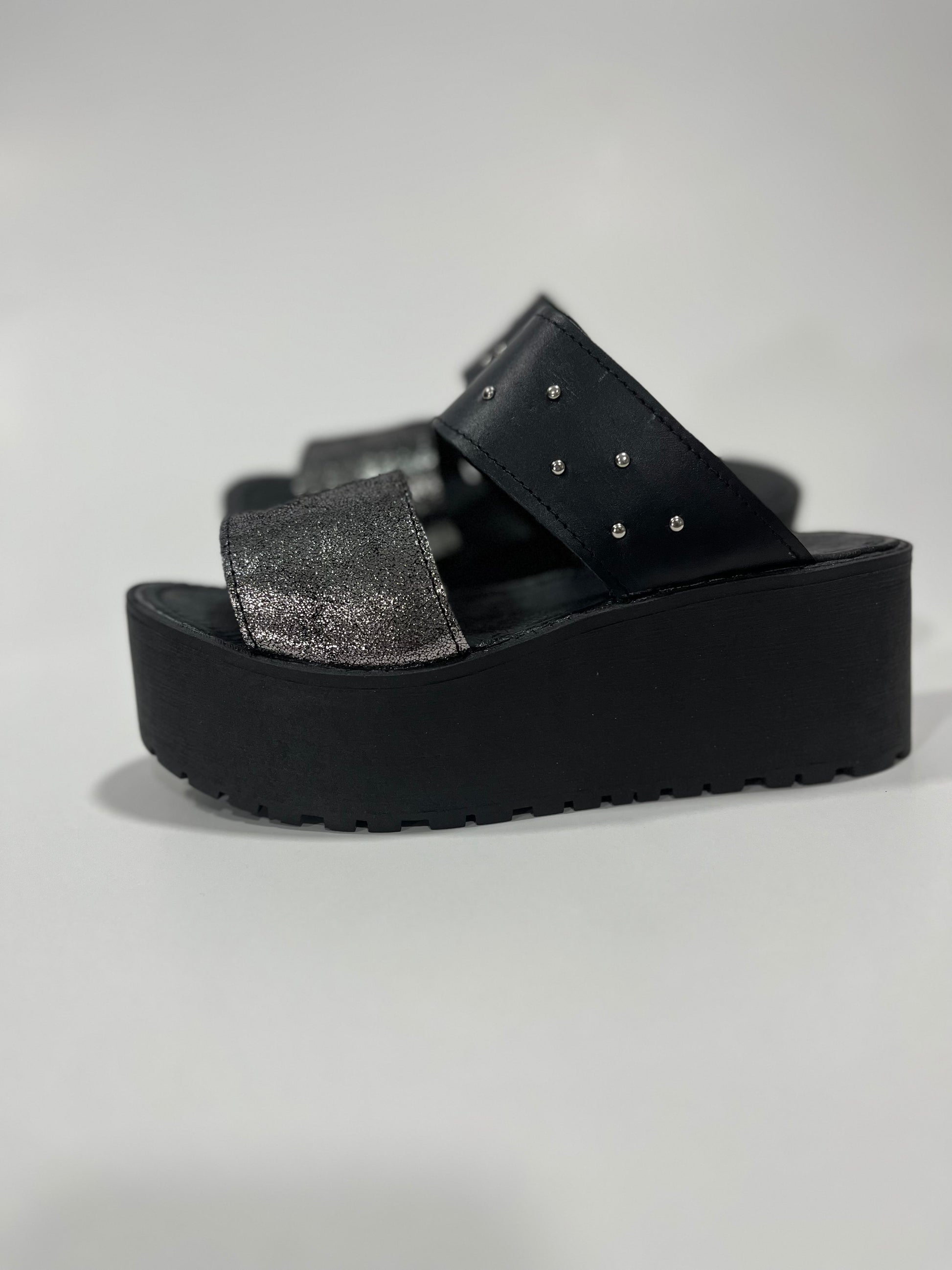 Sandalia de dos cueros, con un elegante tono gris perlado y adornada con tachas negras. Interior de badana natural y suela de goma de 6.5 cm para mayor comodidad. Perfecta para cualquier ocasión.
