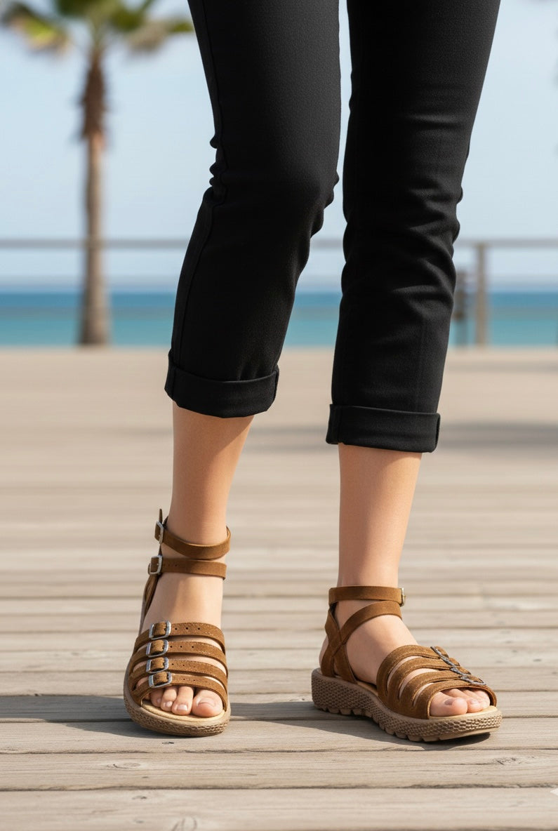 sandalia con suela baja ultraligera combina una empinea ajustable de 100% cuero con hebillas metálicas, ofreciendo una adaptación óptima. Con un peso significativamente reducido, representa la opción más liviana de su categoría, ideal para un uso prolongado y cómodo. La suela de goma asegura una excelente tracción y durabilidad.