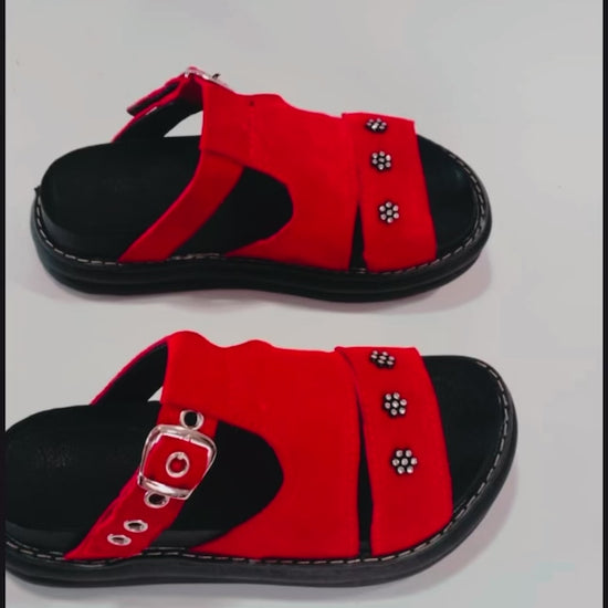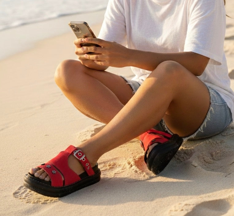 Descubre la pasión del verano con nuestra sandalia Reno en rojo intenso. Con una suela de goma forrada con badana natural y hebillas metálicas ligeras, estarás lista para disfrutar sin preocupaciones. ¡El estilo y la comodidad se unen en esta sandalia de calidad!